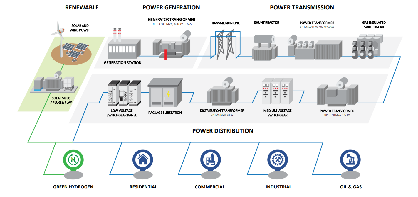 5000 MVA Annual Capacity, Transformers for various, applications up to 10 MVA 33kV class, Inverter duty Transformers, Solar Skid Solutions.